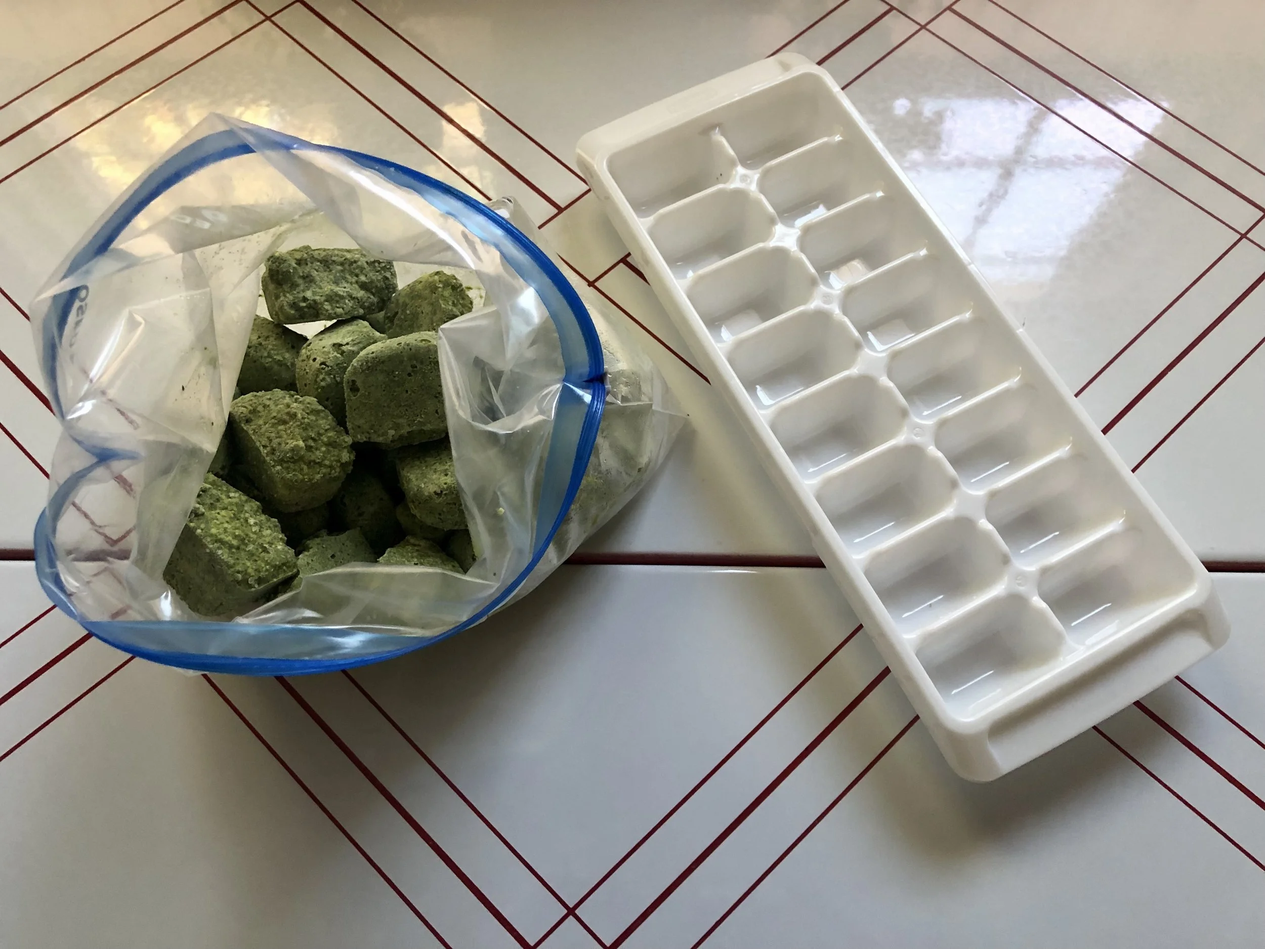 If you’re up to your eyeballs in basil, freezing pesto in ice cube trays gives you perfect pre-measured portions (roughly one tablespoon) ready to toss onto pasta, stir into salad dressings, or spread on top of chicken breasts before baking. All you have to do is spoon pesto into clean, dry ice cube compartments, filling just to the top then cover the tray with plastic wrap or the tray lid to prevent freezer burn. Then freeze the cubes for 3-4 hours until they are solid. Lastly, pop the cubes out and store them in a labeled freezer bag or airtight container, ready to add a plethora of pesto yumminess to so many recipes!
